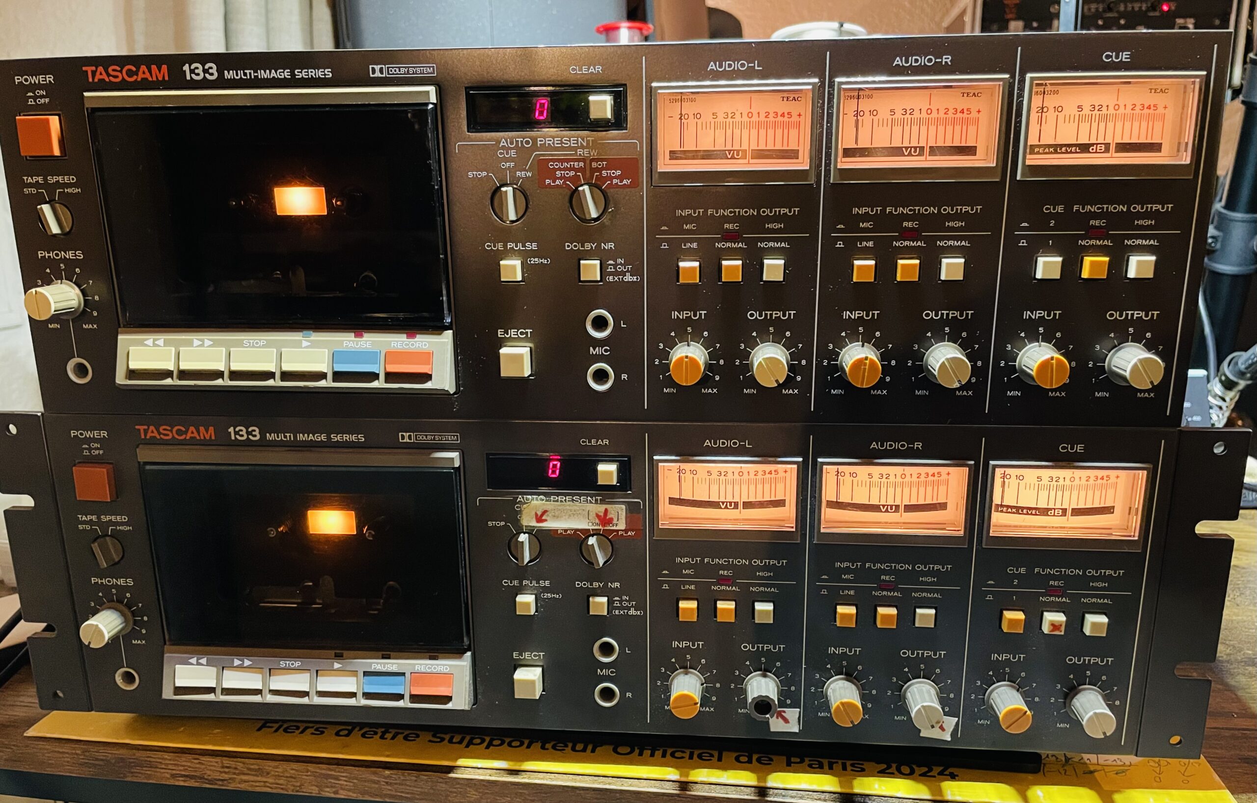 magnétophone à bande OTARI MX5050: inversion des brochages 2 et 3 sur toutes les entrées et sorties, remplacement de la courroie du moteur principal, remplacement des condensateurs chimiques, remplacement lampes vu-mètres et lampes bouton, nettoyage démagnétisation et réglage des têtes magnétiques, nettoyage général, pose d’une nouvelle bobine, nouvelle bande RTM SM900, calibration générale.
